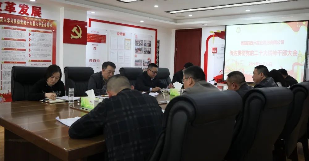 10月25日,酉州實業集團召開傳達貫徹中國共產黨第二十次全國代表大會精神干部大會。會議傳學習了中國共產黨第二十次全國代表大會、中國共產黨第二十屆中央委員會第一次全體會議精神。集團公司班子成員及各部室、子公司負責人參加。